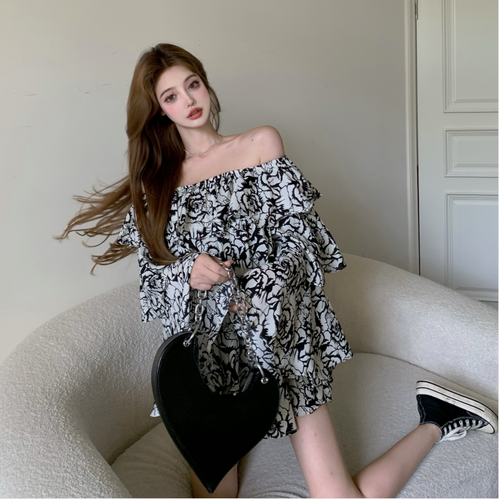 一字肩连衣裙夏季女设计感小众碎花裙短裙2021新款小个子宽松裙子热门设计联盟服务商