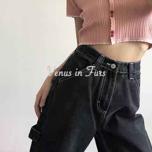 包邮 美式复古 百搭工装风高腰显瘦明线设计口袋宽松直筒牛仔长裤热门设计联盟服务商